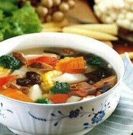 白山藥鮮蔬湯做法介紹 根據(jù)中國傳統(tǒng)食療說法,五色入五臟。這道素湯中用到了:青(青花菜)、赤(胡蘿卜)、黃(玉米)、白(山藥)和黑(黑木耳),稱得上五色俱全,可以全方位地增進健康。