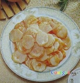 3、炒鍋注油,放入蔥蒜片炒香,再放入番茄丁炒幾下,最后放山藥片,加鹽、味精、糖翻勻,勾芡,出鍋即可。